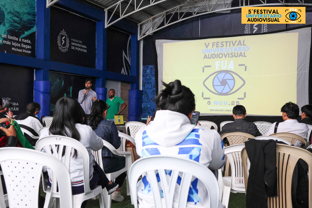 El programa de Comunicación Social de la Fundación Universitaria de Popayán celebró con gran éxito la quinta versión del Festival Universitario Audiovisual «FUA», un espacio que reconoce y promueve la creatividad y el talento de los nuevos realizadores audiovisuales del país. El evento se llevó a cabo en la cancha sintética de la sede San José, en una jornada que reunió a estudiantes, docentes y amantes del cine.